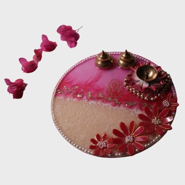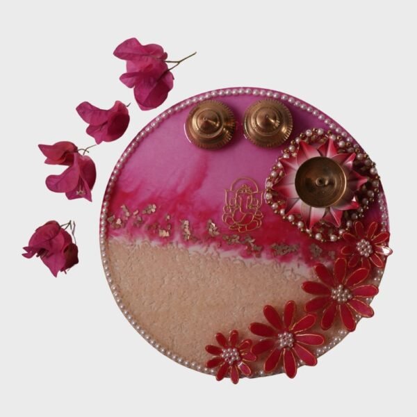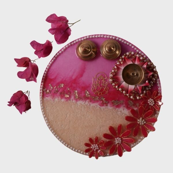 Celebrate your rituals in style with this handcrafted Pink Resin Pooja Thali. Designed with delicate 3D floral embellishments preserved in glossy resin, this thali is both functional and decorative. Whether for daily aarti or grand festivals, it brings a touch of elegance and devotion to your altar.